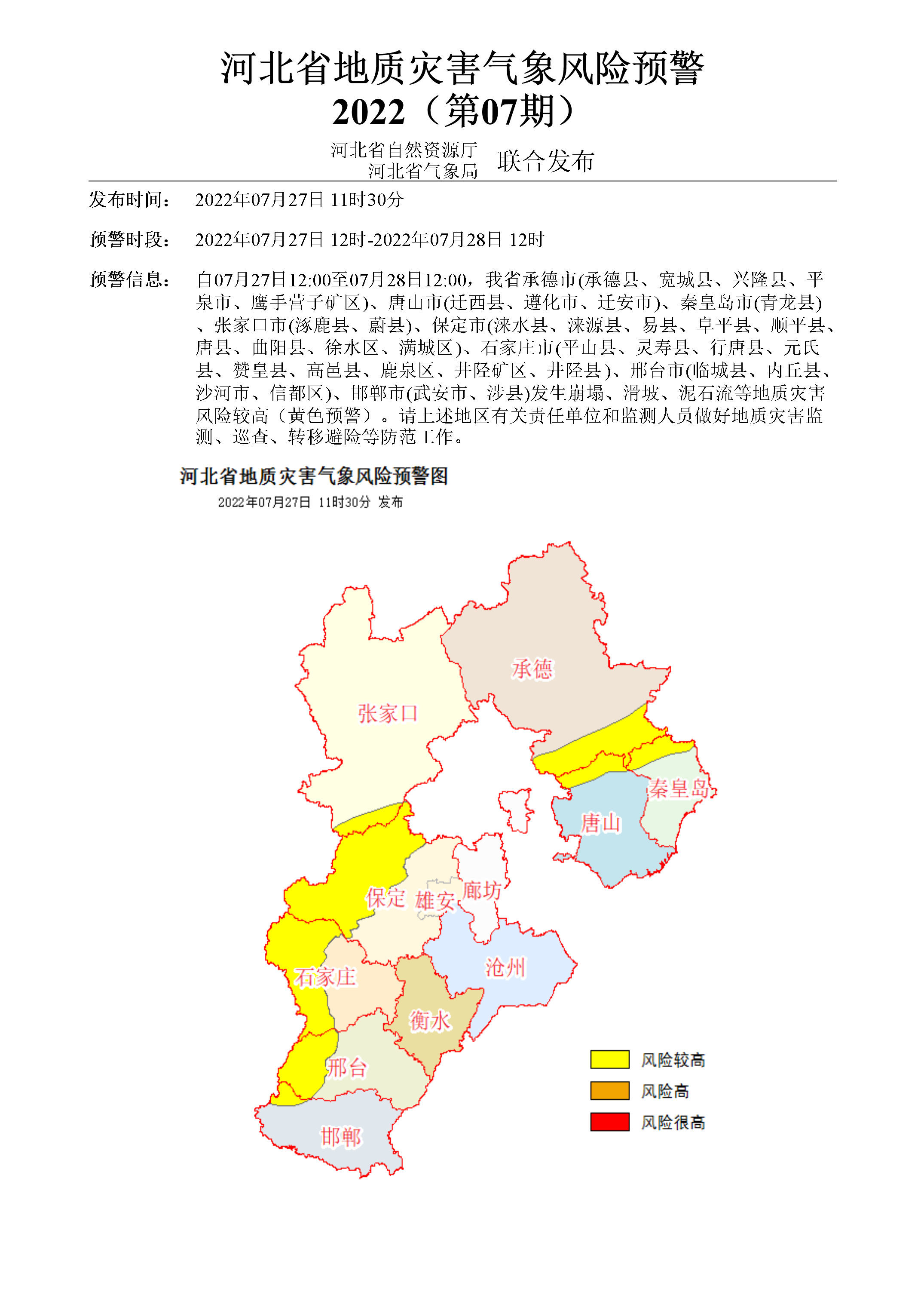 預警時段(2022年07月27日 12時00分 至 2022年07月28日 12時00分)自07月27日12:00至07月28日12:00,我省承德市(承德縣、寬城縣、興隆縣、平泉市、鷹手營子礦區)、唐山市(遷西縣、遵化市、遷安市)、秦皇島市(青龍縣)、張家口市(涿鹿縣、蔚縣)、保定市(涞水縣、涞源縣、易縣、阜平縣、順平縣、唐縣、曲陽縣、徐水區、滿城區)、石家莊市(平山縣、靈壽縣、行唐縣、元氏縣、贊皇縣、高邑縣、鹿泉區、井陉礦區、井陉縣)、邢台市(臨城縣、内丘縣、沙河市、信都區)、邯鄲市(武安市、涉縣)發生崩塌、滑坡、泥石流等地質災害風險較高(黃色預警)。請上述地區有關責任單位和監測人員做好地質災害監測、巡查、轉移避險等防範工作。
